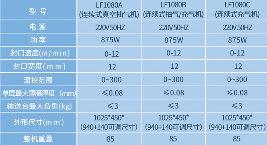 LF1080系列连续式真空抽气/充气封口机。是本公司在广泛吸取同类产品和真空机之精华的基础上研制的专利产品,该产品是根据市场需求而设计的新一代真空、推送、封口、印字集一体的连续式包装机,该机结构简单新颖,外观美丽时尚、功能齐全,自动化程度高,能大幅度减轻操作人员的劳动强度。具有安全可靠,操作简便,真空度高,热合快捷封口美观、牢固等优点。